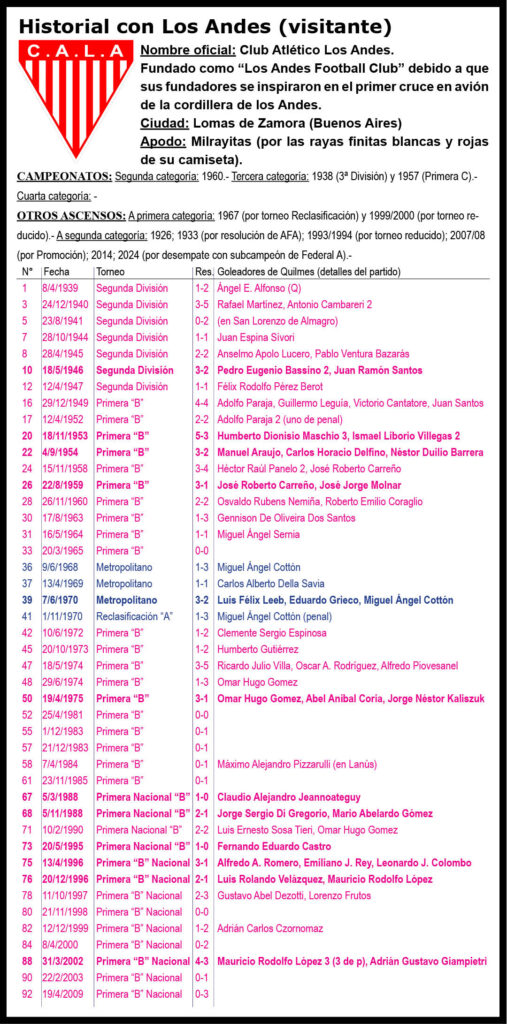 Quilmes visita a Los Andes, equipo con el que se enfrenta desde el campeonato de Segunda División de 1939, cuando los de Lomas de Zamora arribaron a la esa categoría. En aquella primera ocasión (caída 1-2), jugaron el 8 de abril en la cancha que el Milrayitas tenía en la calle Laprida al 1200 de la vecina localidad. Esa tarde, el elenco quilmeño formó con Carlos Rachi; Modesto Vives y Roberto Rodríguez; Juan Saverio Malfatti, Antonio Díaz y Luis Fornere; Jorge Ballejos, Benito Mattas, Ángel Alfonso, Pedro Lofeudo y Oscar Passeggi. Arrancó con ventaja del Decano con gol de Alfonso a los tres minutos. Empató Pollio para los locales y marcó el 2 a 1 Bignone para el equipo lomense.