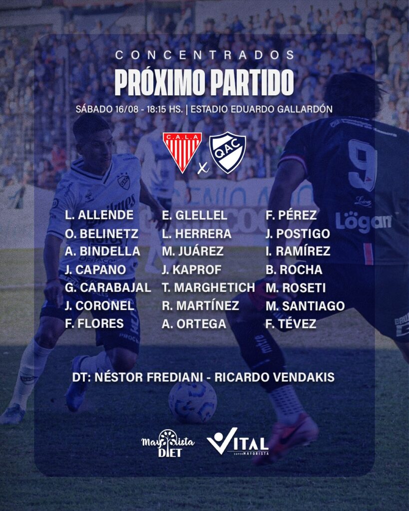 Ayer viernes, el plantel entrenó por la tarde y quedaron concentrados los siguientes jugadores (ver placa). En la lista, aparecen por primera vez los juveniles Agustín Ortega (marcador de punta por derecha) y Brandon Rocha (enganche). El posible once inicial estaría integrado por Esteban Glellel o Lautaro Herrera; Federico Pérez, Federico Tévez, Mirko Juárez y Agustín Bindella; Ramiro Martínez, Joaquín Postigo, Iván Ramírez y Leandro Allende; Gabriel Carabajal y Jano Coronel.