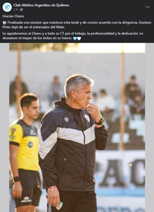 Así fue anunciada por el Club Atlético Argentino de Quilmes el fin del vínculo entre el Mate y el DT Gustavo Pinto: