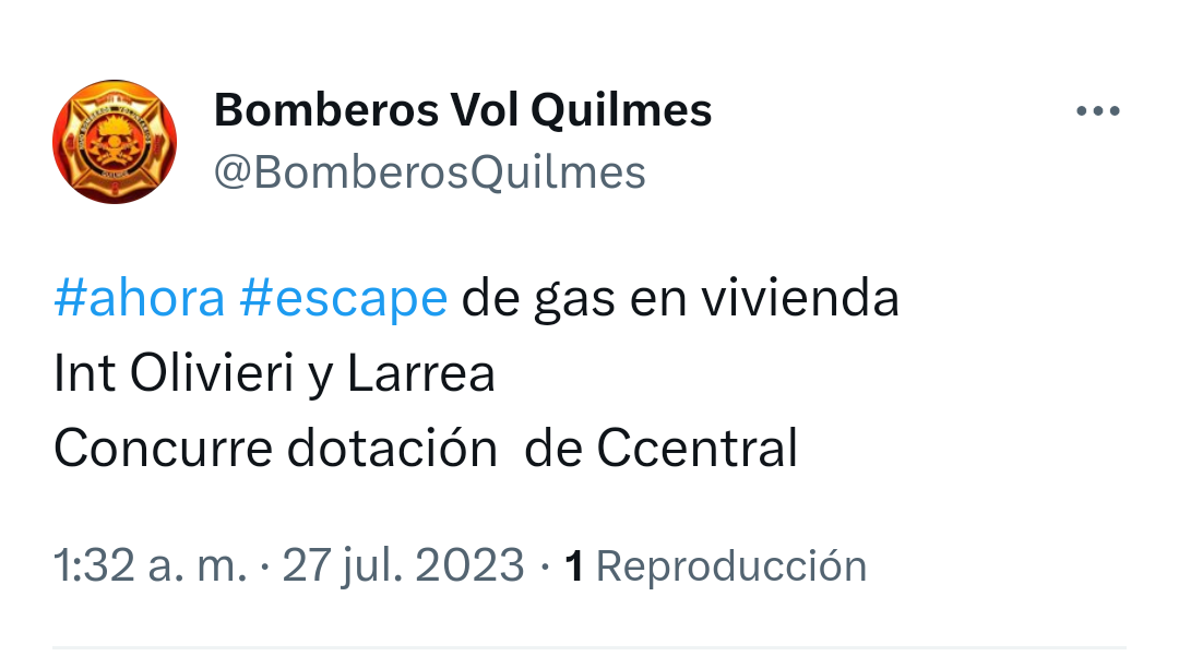 (CIQ) A la 1.30 de la madrugada de este jueves el sonido de la unidad de rescate de bomberos pone en alerta. Buscando en el Twitter del cuartel central, a las 1.32 publicaron que hay un escape de has en Olivieri y Larrea, en el oeste del distrito.