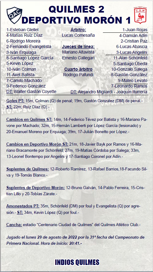 Con la intensidad que propone Walter Gastón Coyette, Quilmes le ganó 2 a 1 a Deportivo Morón y quedó ahí nomás de las líneas de clasificación a Copa Argentina y torneo reducido por el segundo ascenso. Los goles fueron de Iván Colman (penal) y Matías Ruíz Díaz.