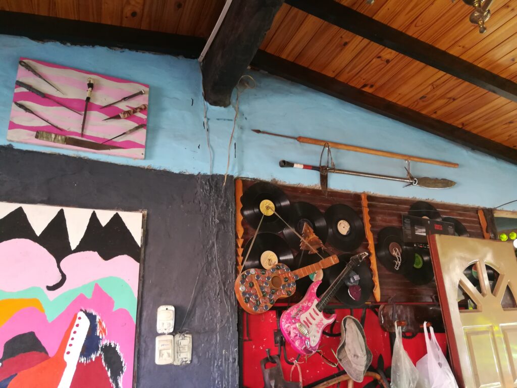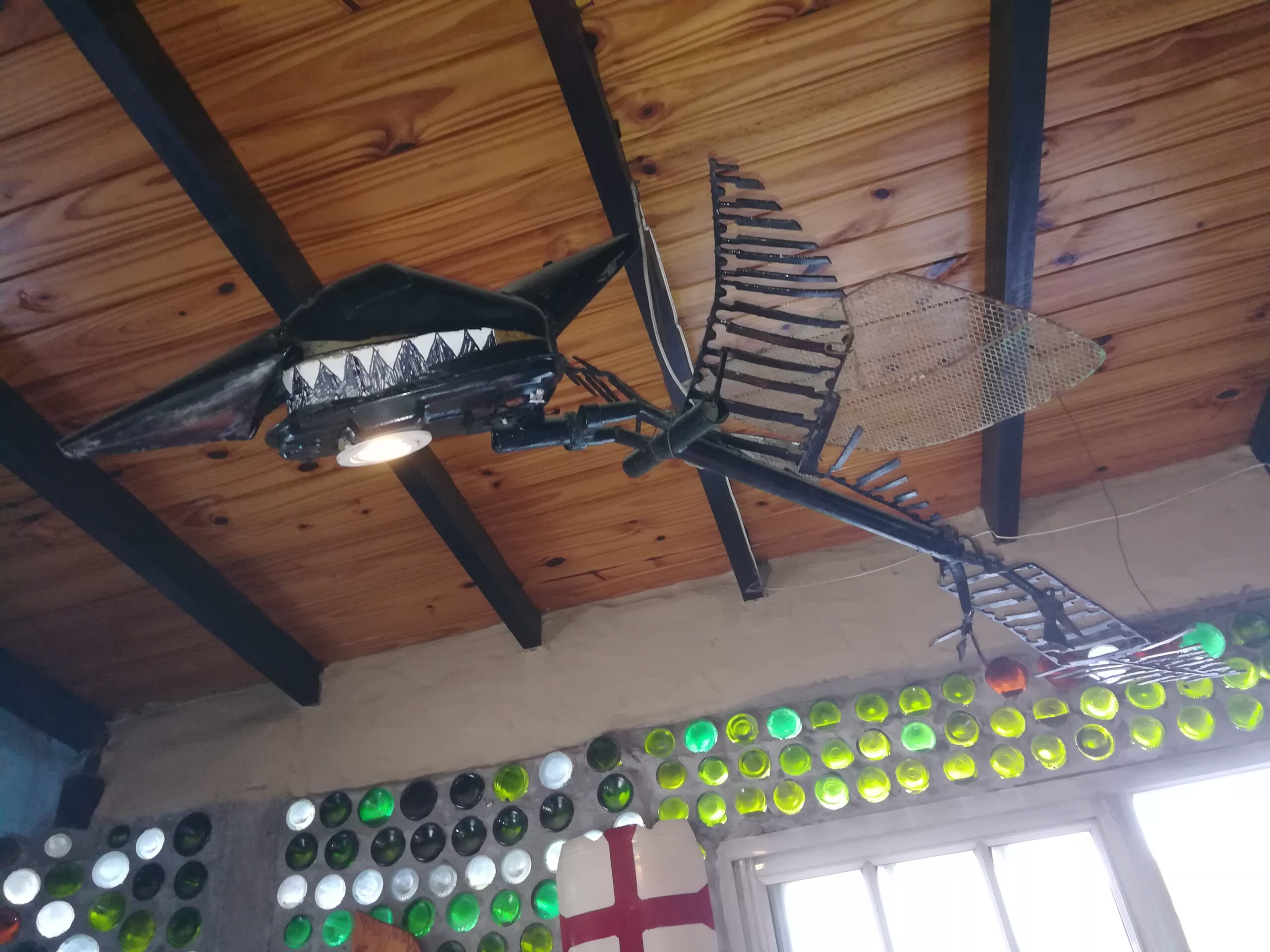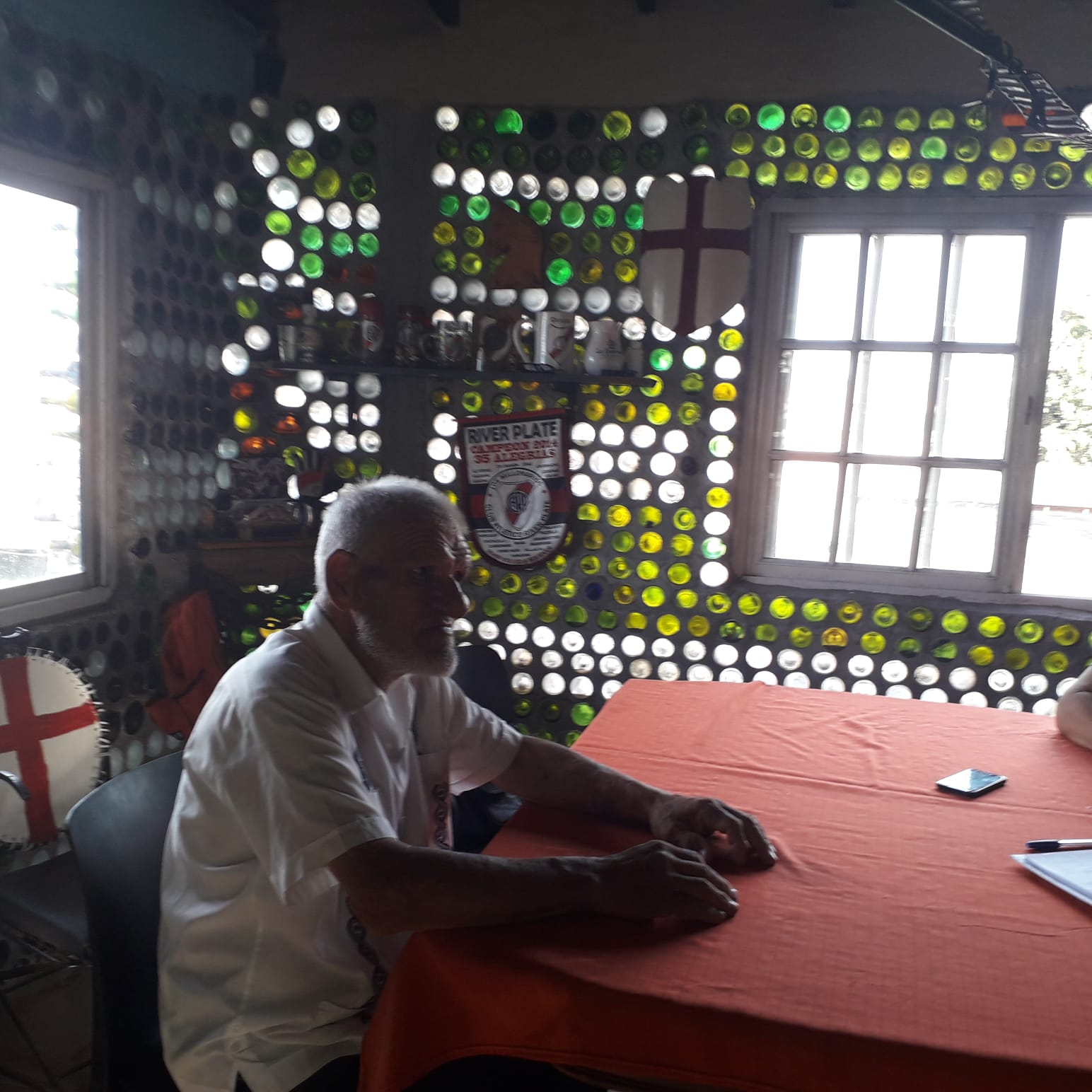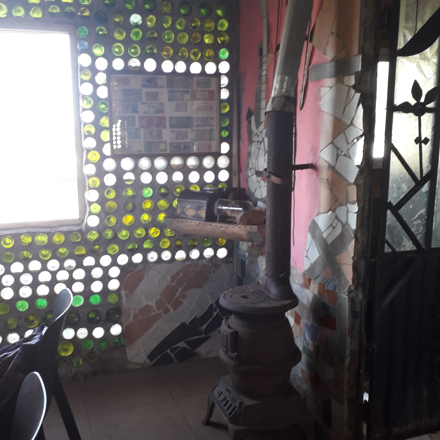 Es difícil describir el aura que lo rodea, la luz que entra en ese ambiente cálido en que nos recibió, rematado por un techo de madera que también él hizo con uno de sus hijos, o las 16.000 botellas, selladas con sus corchos que compraba allá por el 2000 a los cartoneros recolectores urbanos. Por eso las fotos, que hablarán mejor del lugar que unas palabras.