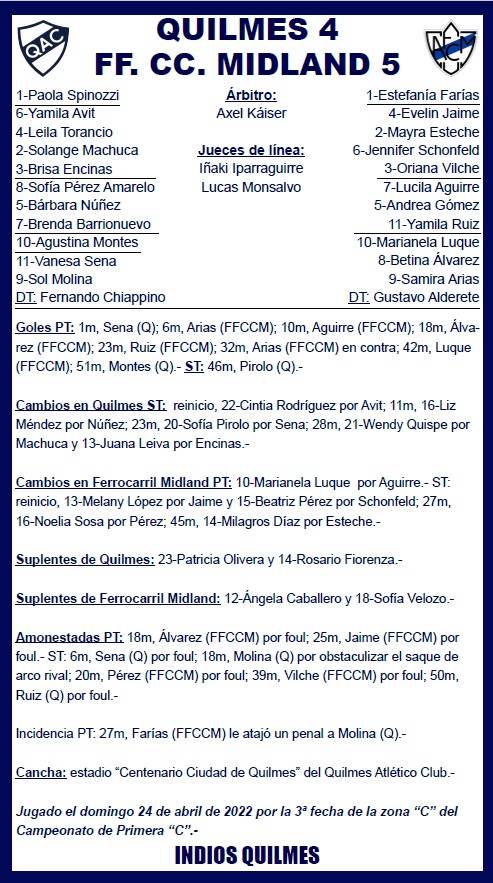 Quilmes cayó 4-5 frente a Ferrocarril Midland en el Estadio Centenario por la tercera fecha del campeonato de Primera C. Vanesa Sena, Agustina Montes y Sofía Pirolo marcaron los goles de equipo cervecero en su debut en el Centenario por competencia en AFA.