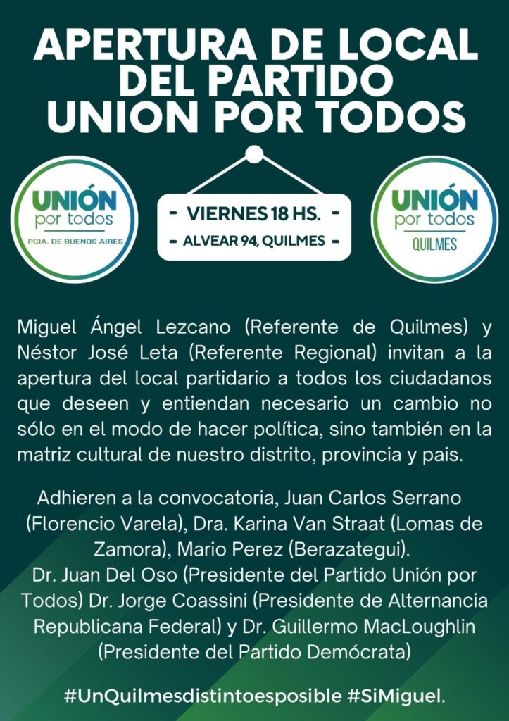 El partido Unión Por Todos que sigue a Javier Milei abrirá su local en Alvear 94, con un acto de inauguración el viernes desde las 18, según informó su referente local Néstor Leta.