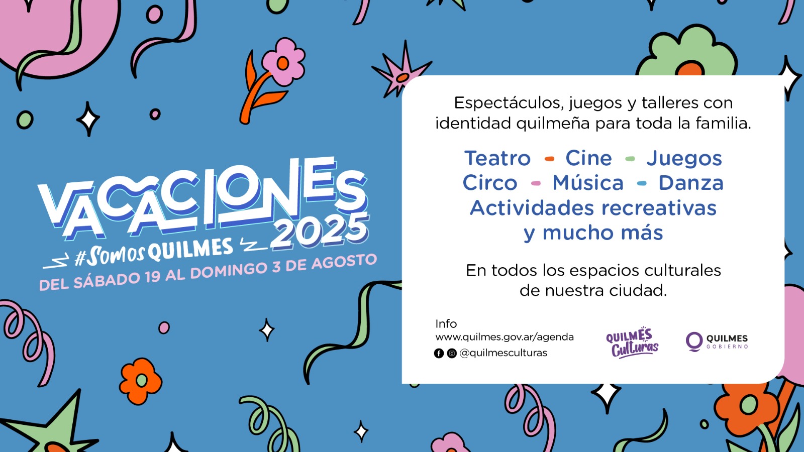El Municipio informa que el receso invernal, en el marco del programa Vacaciones Somos Quilmes 2025, entre el sábado 19 de julio y el domingo 3 de agosto, se desarrollará un completo cronograma con más de 400 actividades recreativas y culturales, que contarán con la participación de más de 200 artistas, y estarán destinadas a toda la familia, con especial foco en niños y niñas. Además, contará con un impresionante Parque de Juegos, en el Polideportivo Municipal. Todas las propuestas son de acceso libre y gratuito, y se llevarán a cabo en diferentes espacios del distrito.