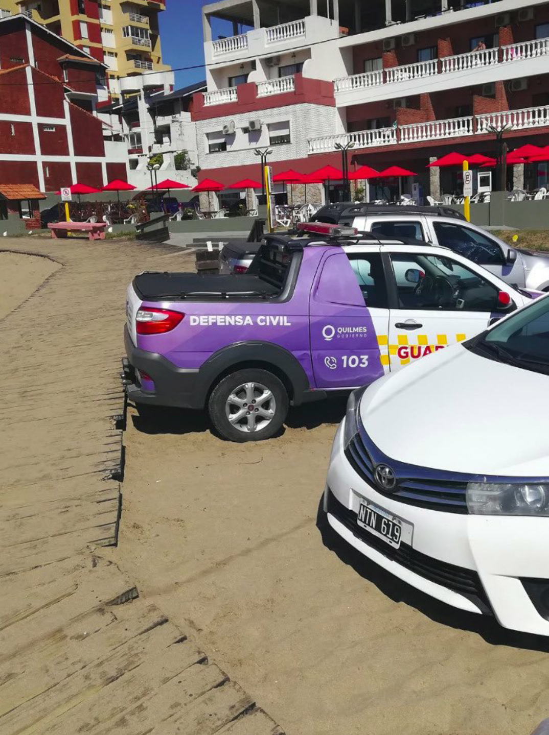 La foto en la que aparece una camioneta municipal pertenece a una playa de Villa Gesell a la que trabajadores de Defensa Civil que se desempeñan como Guardavidas en Quilmes asistieron con motivo de una reunión de trabajo entre el Sindicato de Guardavidas y personal de guardavidas de otros municipios para intercambiar experiencias de trabajo en el marco del Plan de Seguridad Acuático.