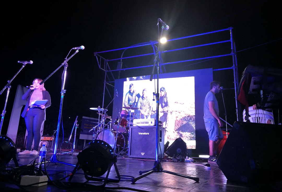 El grupo acústico electrónico «La perra que lo parió«, con un invitado, Diego, que ejecutó una viola mientras detrás en pantalla gigante pasaban emotivas imágenes de aquella guerra, y de la prensa de la época.