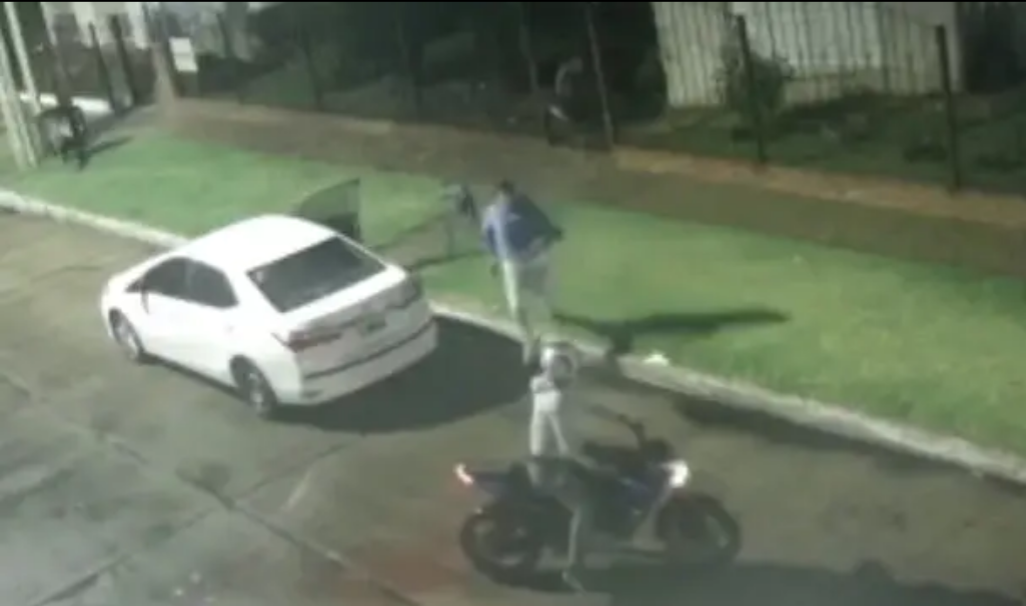 El tremendo hecho de inseguridad, que quedó registrado por una cámara de la cuadra, ocurrió este domingo 1 de enero a las 20.40 frente a una casa situada en la esquina de las calles Argentino Roca e Irala. Una pareja de adultos bajaba del auto y se disponía a ingresar a su vivienda cuando aparecieron motochorros.