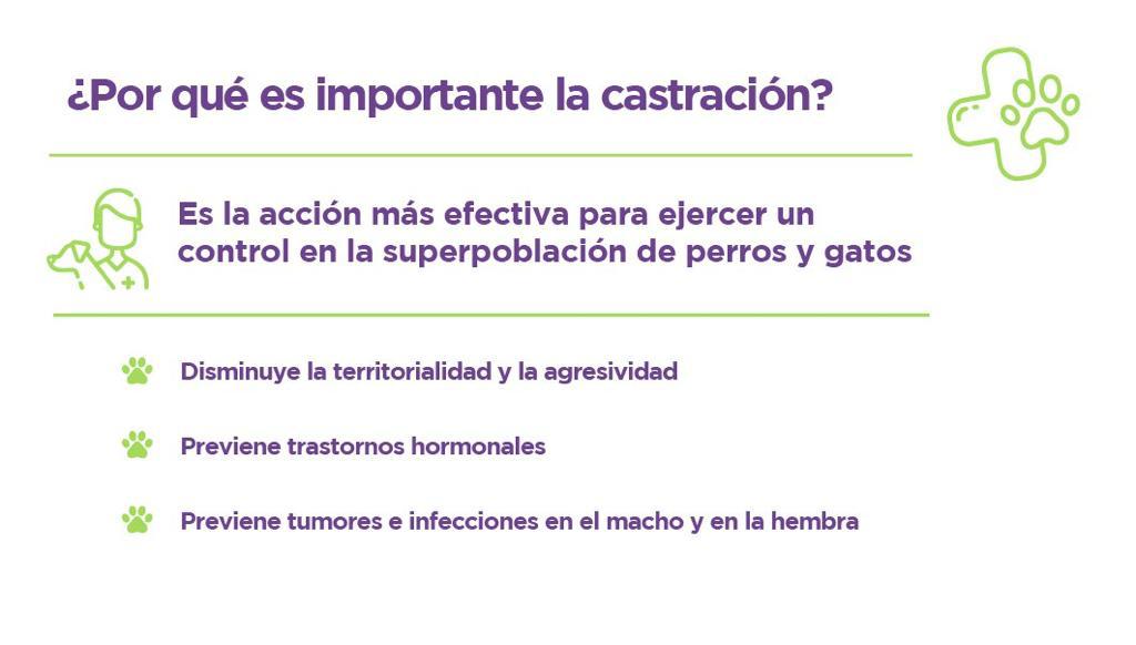 La castración es la acción más efectiva para ejercer un control en la superpoblación de perros y gatos, también disminuye la territorialidad y la agresividad, previene trastornos hormonales, ciertos tumores tanto en el macho como en la hembra e infecciones en el tracto reproductor.