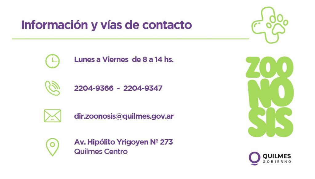 Los horarios de atención de Zoonosis son de lunes a viernes de 8 a 14, en avenida Yrigoyen 273, en Quilmes Centro. Para comunicarse, enviar correo a dir.zoonosis@quilmes.gov.ar, o por teléfono al 2204-9366, o 2204-9347.
