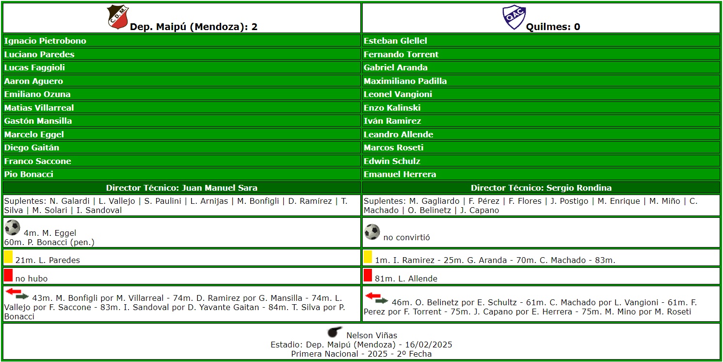 Se escapó Eggel, tocó para Bonacci y Kalinski derribó a este último. El penal clarísimo, sancionado por un muy bien ubicado árbitro, sentenció el 0-2 para Quilmes. Nada sirvió, a pesar de los gestos elocuentes de Rondina desde el banco y los ingresos del debutante Mariano Miño y Juan Ignacio Capano. Para coronar la debacle, en una escapada de Eggel, Allende lo agarró de la camiseta justo antes de que ingrese al área de cara a Glellel. Viñas cobró el foul y expulsó al cervecero. Con diez hombres terminó Quilmes un partido en el que la última jugada también fue de Maipú: el ingresado Silva se escapó por izquierda y su remate se fue apenas desviado.