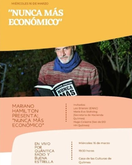 El miércoles 16, como publicitó este CIQ, en la Casa de las Culturas (Rivadavia 383), se recibió la visita del periodista Mariano Hamilton, con su libro «Nunca Más Económico»: