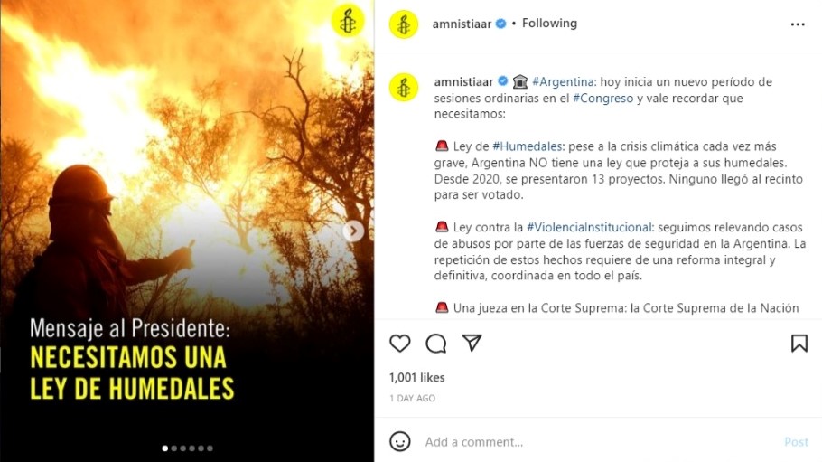 ✉️ Principales ejes de la carta En primer lugar, la pandemia COVID-19 ha visibilizado numerosos casos de violencia institucional y uso excesivo de la fuerza por parte de agentes de seguridad en todo el país frente a lo cual Amnistía Internacional ha relevado más de 30 casos en todo el país que incluyeron situaciones de malos tratos, tratos degradantes, amenazas, uso excesivo de la fuerza e, incluso, el asesinato por parte de miembros de diferentes fuerzas de seguridad. Sin embargo, muchos otros casos que se siguieron registrando a lo largo de 2021 ilustran prácticas abusivas, fuertemente arraigadas y extendidas por parte de las fuerzas de seguridad de todo el país. La organización considera que, dada la repetición de estos hechos, es necesaria una profunda reforma a partir de medidas integrales y definitivas, coordinadas entre todas las jurisdicciones del país y con el involucramiento de todos los niveles del Estado. En este sentido, el debate de una ley contra la violencia institucional en la agenda parlamentaria de este año es un paso en esa dirección. Por otro lado, los incendios que arrasaron la provincia de Corrientes este verano, alcanzando la zona de los Esteros del Iberá, dejó en evidencia no solo el agravamiento de la crisis climática sino también sus efectos que, año tras año, se sienten con mayor magnitud en la Argentina y el mundo. En este sentido, una Ley de protección de los Humedales consensuado con la sociedad civil sería un importante avance para dar respuesta a la grave crisis climática y de incendios que amenaza con agravarse. A su vez, el año pasado el Congreso de la Nación omitió dar tratamiento a la prórroga de la ley de Emergencia territorial (Ley 26.160) que vencía en noviembre de ese año. Si bien la norma, indispensable para para la promoción y protección de los derechos de los pueblos indígenas, fue finalmente aprobada mediante Decreto 805/2021 del Poder Ejecutivo, el Congreso tiene aún la oportunidad de respaldarla. Por otro lado, desde 2018 Amnistía Internacional se ha propuesto visibilizar la violencia de género online, como otra de las manifestaciones de la violencia contra la mujer y personas LGBTI+. La falta de acción de los Estados y las empresas para garantizar el respeto por los derechos humanos y hacer frente a la violencia y el abuso online empuja a quienes la padecen hacia una cultura de silencio. En este sentido, deben adecuarse las leyes para combatir la violencia de género en su dimensión online y que, de esta forma, se garantice la supervisión del diseño, el desarrollo y la implementación de los sistemas algorítmicos con perspectiva de género para que las empresas sean legalmente responsables. Finalmente, subsisten dos deudas institucionales que la organización estima de alta y urgente prioridad y en las que el Congreso juega un rol central. Por un lado, desde hace 12 años el Congreso de la Nación no designa a una persona a cargo de la Defensoría del Pueblo de la Nación, organismo que sigue vacante y que es central en la defensa de los derechos humanos y el control de los actos de gobierno. Asimismo, resulta preocupante no solo la demora para completar la composición de la Corte Suprema de Justicia de la Nación tras la renuncia de Elena Highton de Nolasco, el pasado 1 de noviembre, sino también que el máximo tribunal del país carezca de perspectiva de género a la hora de emitir sus fallos e impartir justicia. Desde el 15 de diciembre pasado se encuentra vencido el plazo para el envío del pliego al Senado para ocupar el cargo vacante. A nadie parece preocuparle. Por todo ello, Amnistía Internacional envió esta carta al presidente Fernández, también remitida a la Presidencia de la Cámara de Diputados y de la Cámara de Senadores, con la expectativa de que sean incluidas para su abordaje y aprobación en las sesiones ordinarias que inician el 1 de marzo. |