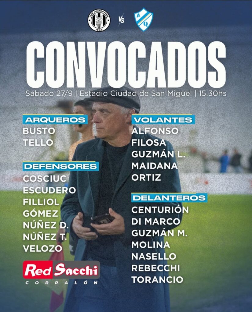 Con algunas vueltas para este partido los convocados son Facundo Busto, Alejo Tello; Fernando Cosciuc, Agustín Escudero, Fabricio Filliol, Mauro Gómez, Demian Núñez, Tomás Núñez, Geronimo Velozo, Sebastián Alfonso, Lautaro Filosa, Leandro Guzmán, Cristian Maidana, Alan Ortiz, Franco Centurión, Valentino Di Marco, Maximo Guzmán, Joaquín Molina, Agustín Nasello, Lucas Rebecchi y Elías Torancio. De estos uno quedará afuera. El posible 11 de Argentino de Quilmes lo conformarían Tello; Filliol, Cosciuc, Velozo o Gómez y Tomás Núñez; Leandro Guzmán, Filosa, Alfonso y Molina; Rebecchi y Torancio.