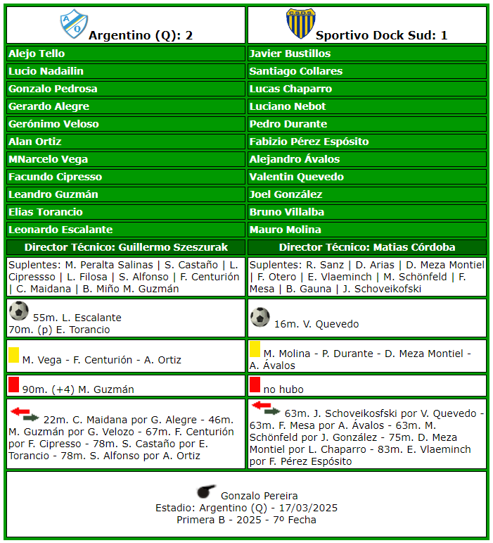 (CIQ) Argentino le dio vuelta el resultado a Dock Sud en La Barranca y se quedó con un triunfo muy importante que lo deja en la tercera posición. Los goles del Mate fueron de Escalante y Torancio de penal, Quevedo anotó para la visita. A Dock Sud le costó el partido después de encontrarse con el gol y no logra sacarle el invicto al Mate que todavía no perdió en su cancha.