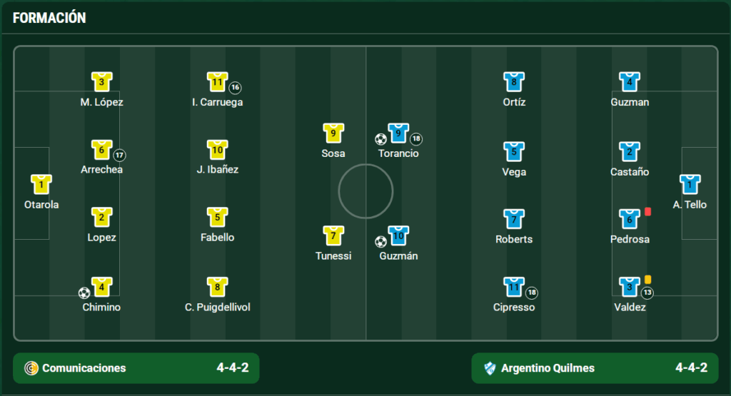 El encuentro tuvo un intenso juego desde el comienzo, Comunicaciones tomó la posición, mientras que el visitante espero con su bloque defensivo. En el Mate se vio una dinámica de juego que hace mucho no tenía, lo que ayudó en el momento de conectar pases y generar jugadas. En este contexto, aprovechó los espacios que le dejaban, gracias a eso llegó rápido el gol a los 7 minutos. La recuperaron en campo propio y Ortiz con un pase largo lo dejo a Torancio mano a mano contra el arquero cartero Fernando Otarola. El delantero quilmeño definiendo muy bien y puso arriba a Argentino de Quilmes por 1 a 0.