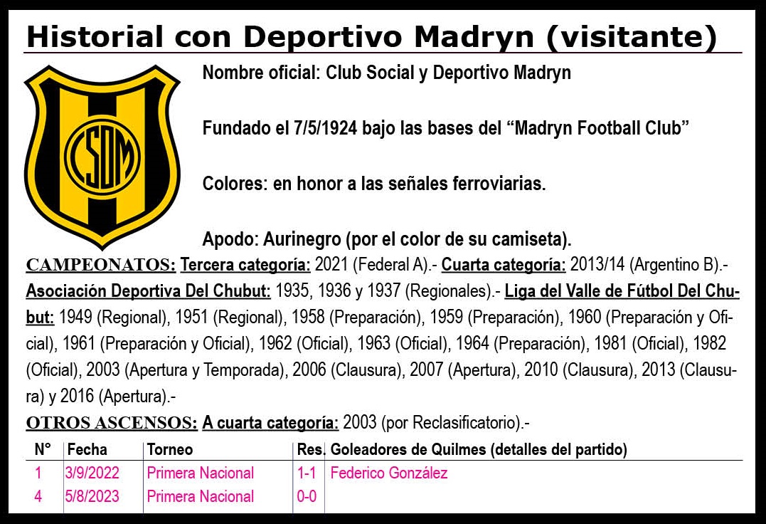 En total, jugaron cinco cotejos cerveceros y aurinegros. Quilmes ganó uno (y marcó cinco goles), empataron cuatro veces y Deportivo Madryn no ganó ninguno (y convirtió tres tantos). Más allá de estar invicto, el Cervecero lleva dos cotejos sin vencer (ambos empates). El único triunfo se dio el 3 de abril de 2023 por 2 a 0 en el Centenario con goles de Federico Anselmo e Iván Colman.