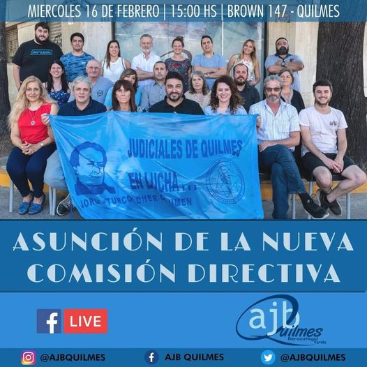 La conducción de la Asociación Judicial Bonaerense (AJB) de Quilmes, Varela y Berazategui llevó adelante su acto para la asunción de la nueva Comisión Directiva de esta Departamental. Tuvo lugar este miércoles 16, desde media tarde en la sede gremial de Brown 147, Quilmes. Los asistentes debieron respetar los protocolos sanitarios, aunque algunos optaron por participar de manera virtual a través de la transmisión en vivo por la página de Facebook (video grabado).
