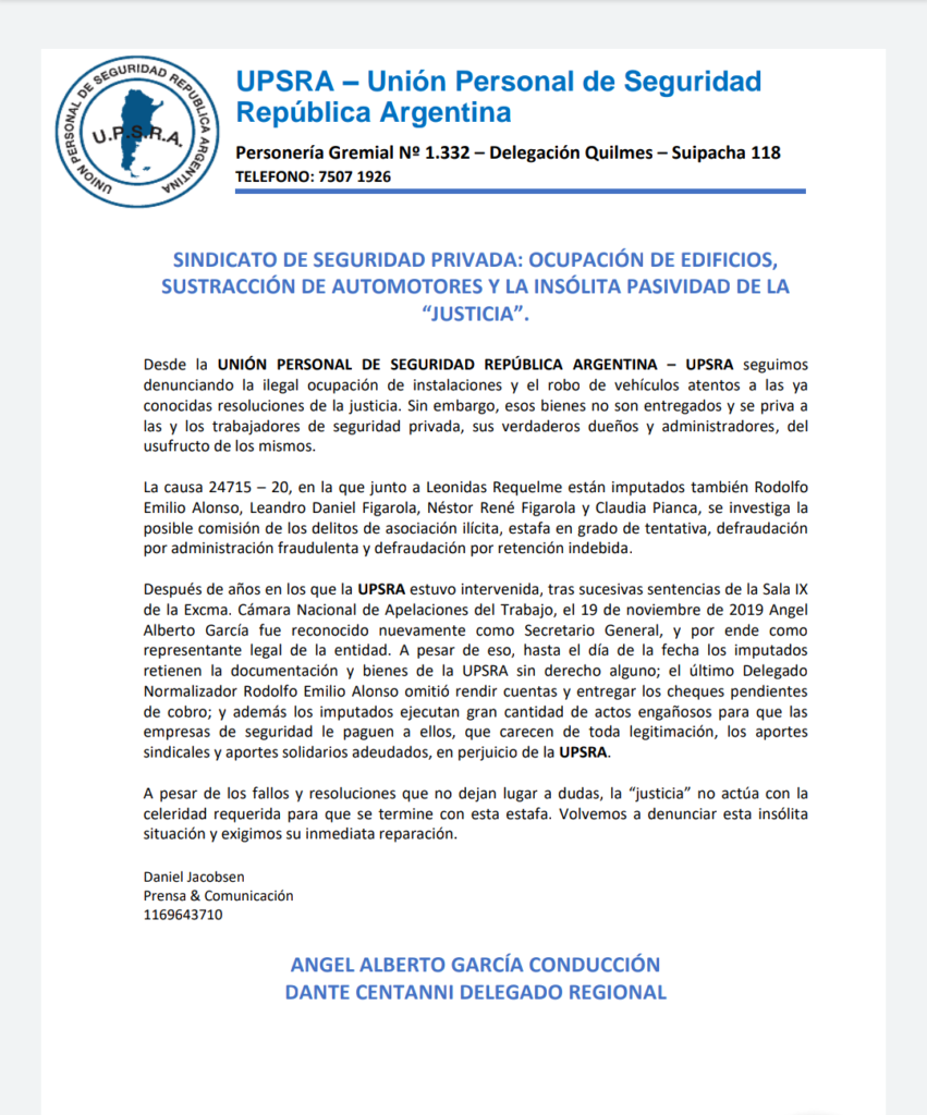 Graves anomalías se denuncian desde la sede Quilmes del UPSRA, sindicato que reúne a trabajadores de la seguridad.