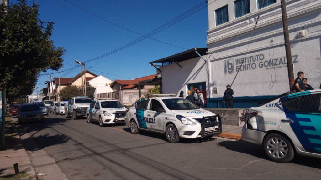 Una decena de patrulleros acudieron esta tarde al lugar, ubicado en las calles Misiones y Viejo Bueno, de Bernal Oeste, a brindar seguridad, ya que padres muy alterados se convocaron para pedir explicaciones a las autoridades