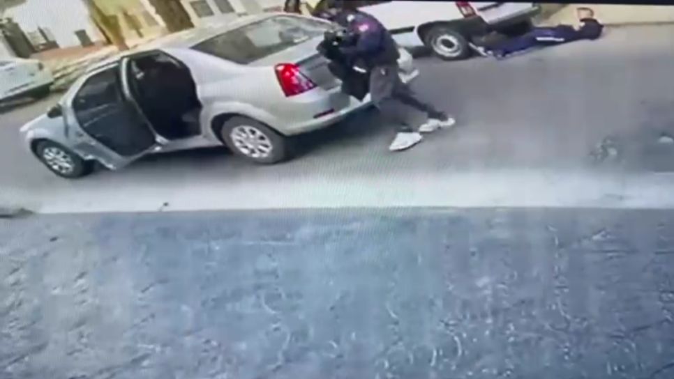 En la captura de portada se ve cómo los ladrones bajan de un auto gris en medio de la calle, para robar la camioneta; en la segunda secuencia, el damnificado queda tirado en el piso, mientras le roban sus pertenencias y su vehículo.