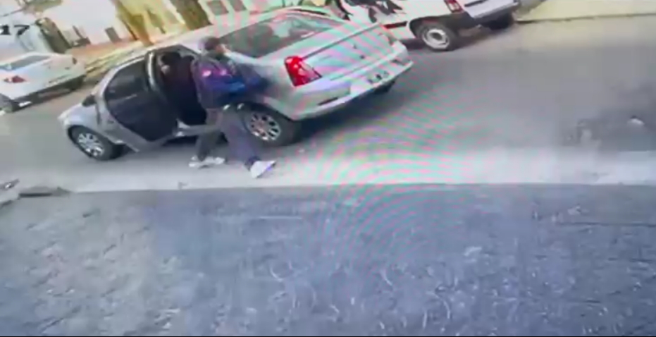 En la captura de portada se ve cómo los ladrones bajan de un auto gris en medio de la calle, para robar la camioneta; en la segunda secuencia, el damnificado queda tirado en el piso, mientras le roban sus pertenencias y su vehículo.