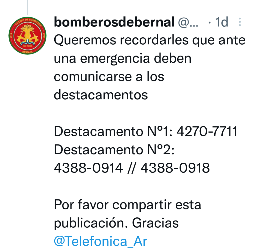 El cuartel sobre Dardo Rocha 270 tiene cortadas sus tres líneas telefónicas desde hace más de una semana. Hicieron varios reclamos a Movistar, pero no consiguen que los atiendan de manera personal, toda comunicación es virtual como sucede con cualquier ciudadano. No pueden recibir ni llamadas de urgencia.