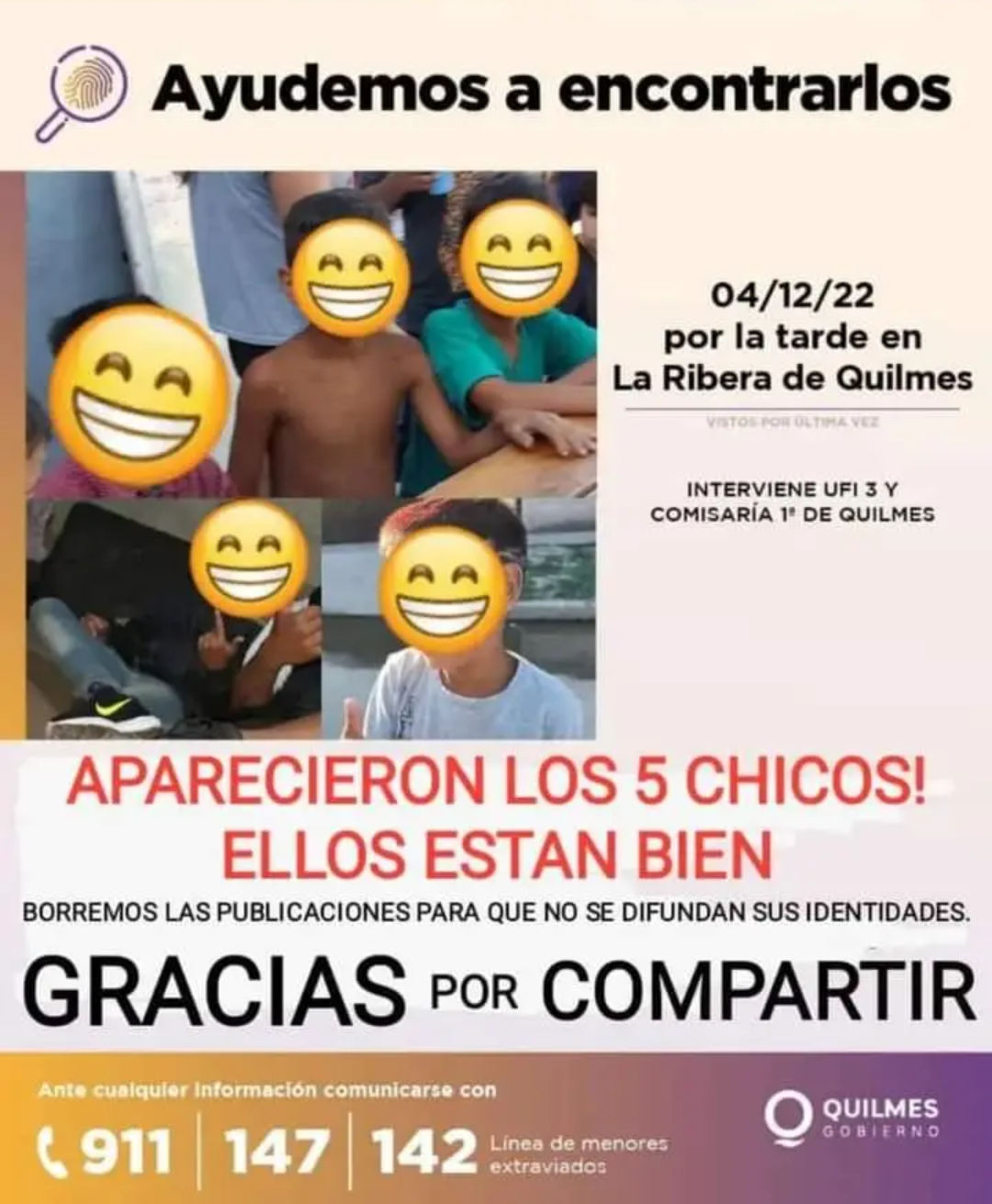 Tienen 11, 8, dos de 7 y uno de 6 años, se trata de cuatro hermanitos y un amigo. El padre de uno de ellos manifiesta que desde el Ministerio de Seguridad le confirmaron que con las cámaras del municipio fueron monitoreando al vehículo, pero después se perdió el rastro en Almirante Brown.
