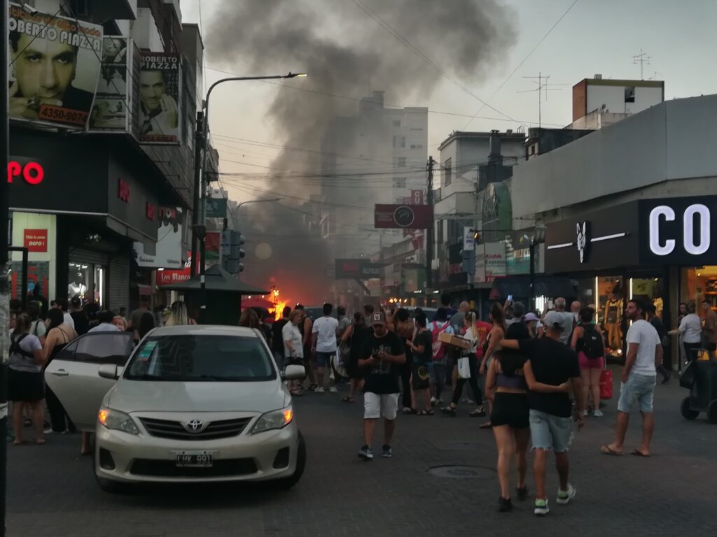 La Policía actúa con celeridad alejando a los peatones, es una vereda muy transitada, hay mesas en la calle, de gastronomía.