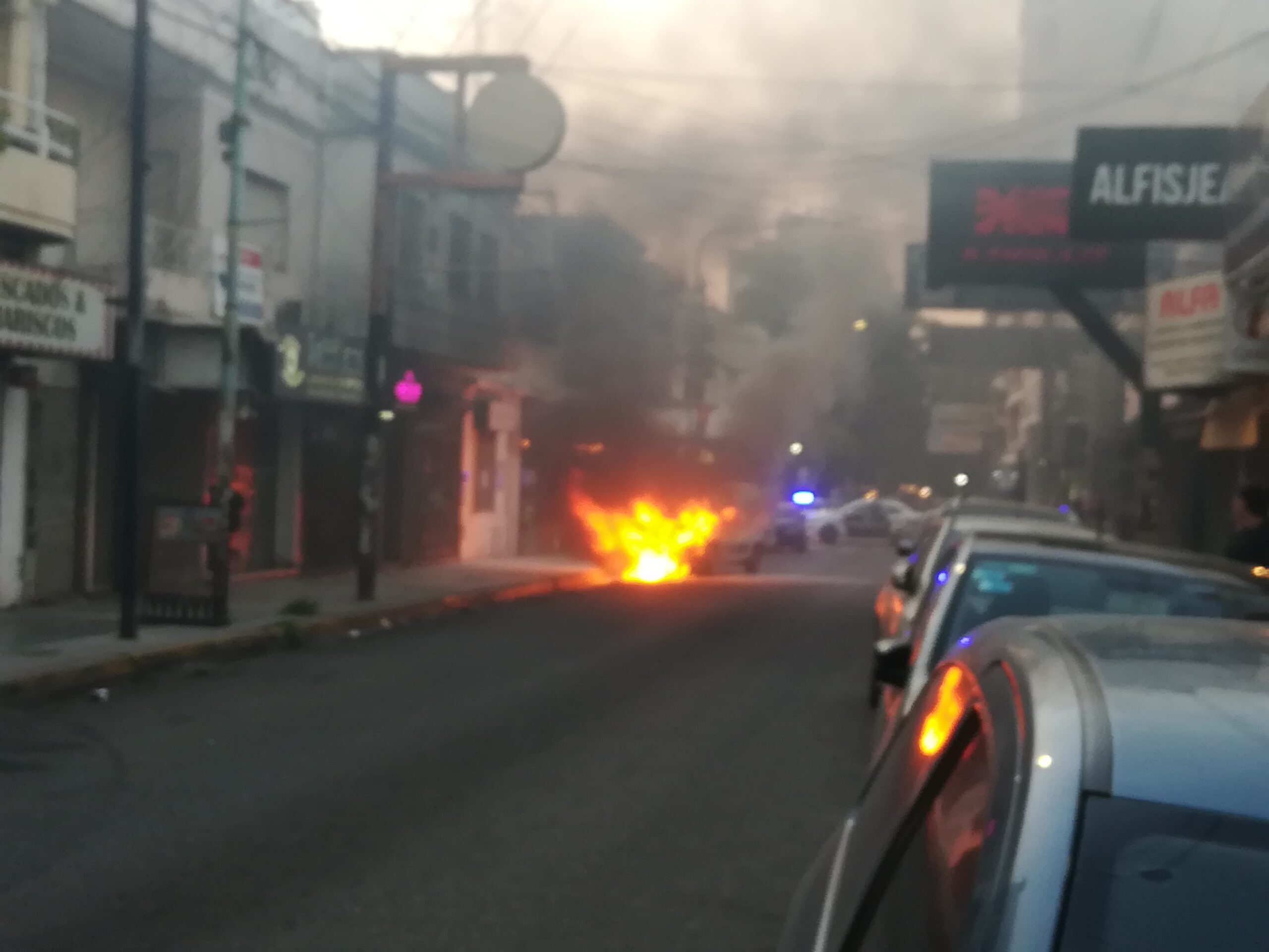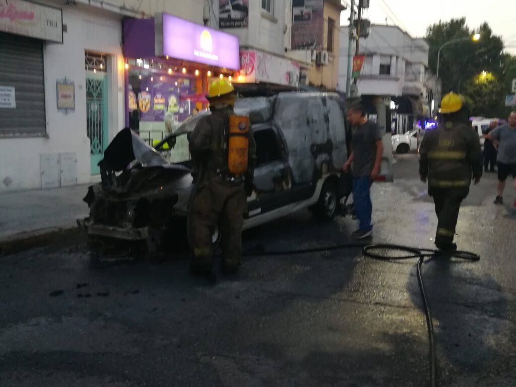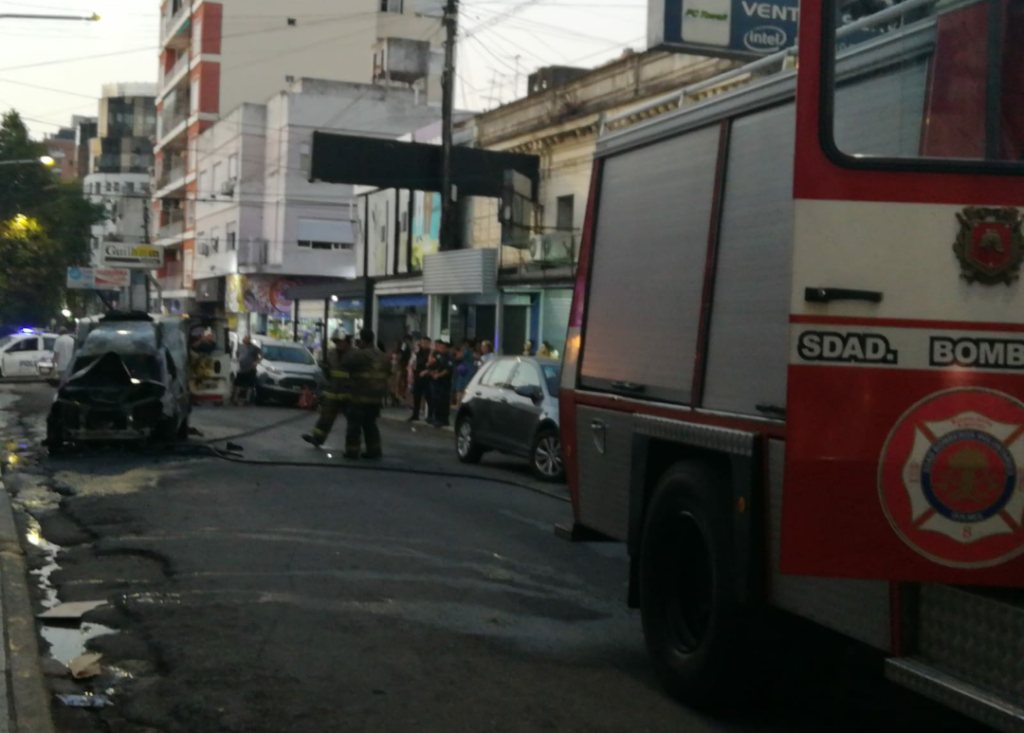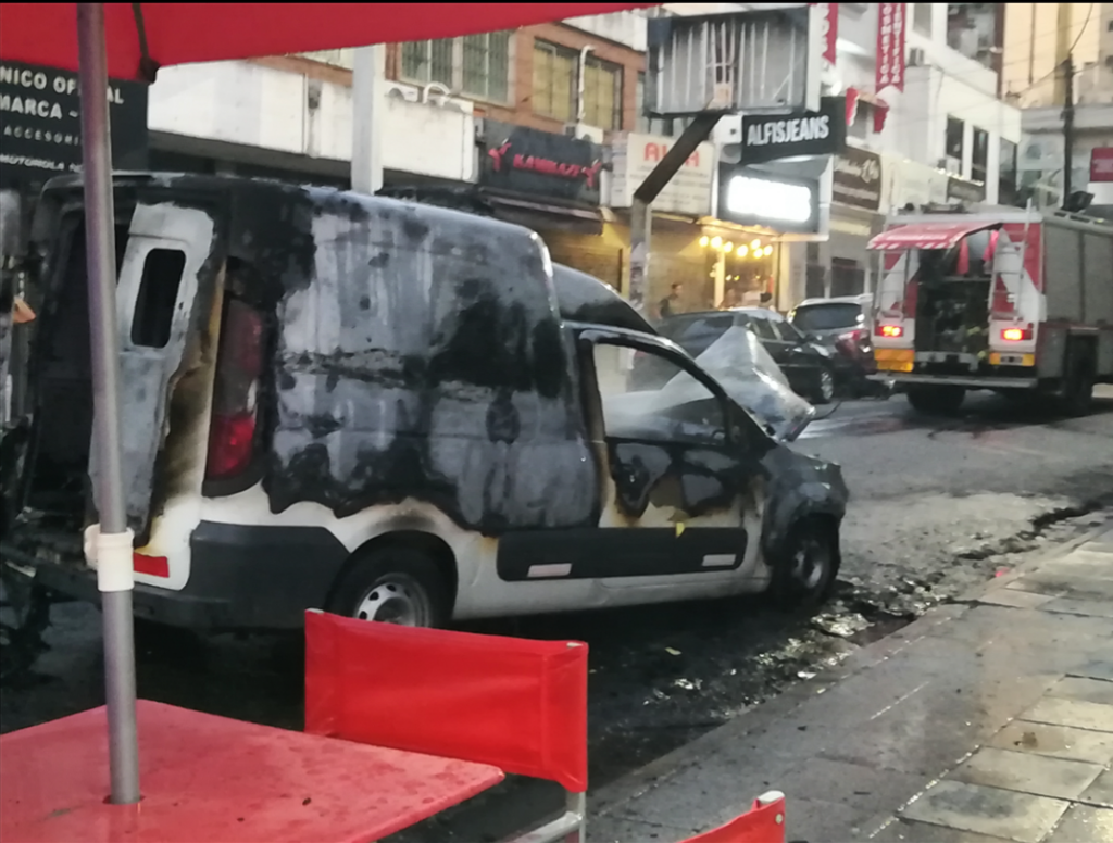Una camioneta tipo utilitaria está ardiendo en Moreno y Alsina, en esta tarde de viernes. Comenzó el fuego minutos antes de las 19,30.