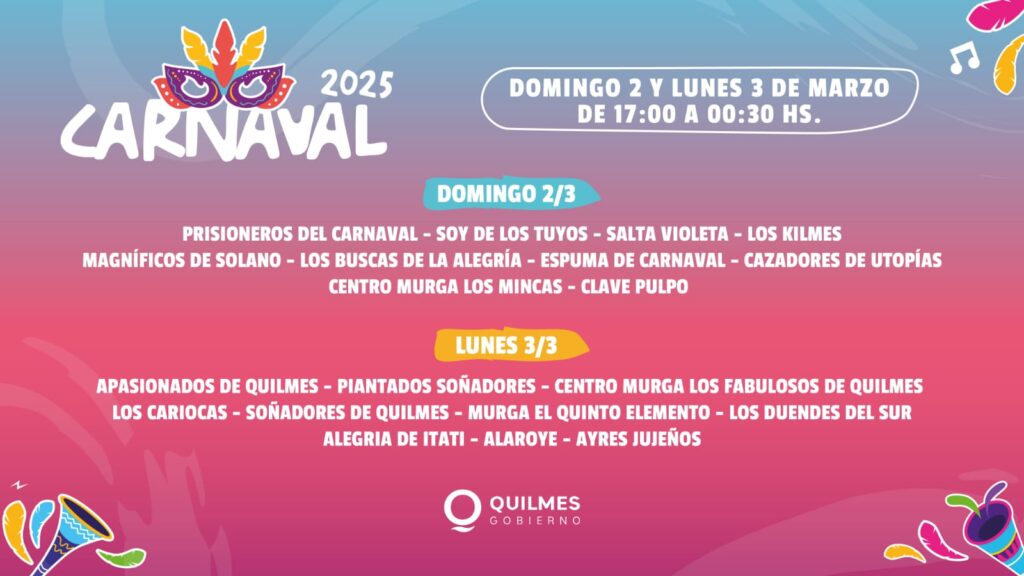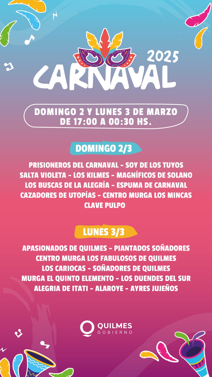 Por su parte el lunes 3, el cierre estaría a cargo de la banda de cumbia pop oriental, Márama, y la previa con las murgas Apasionados de Quilmes; Piantados Soñadores; Centro Murga Los Fabulosos de Quilmes; Los Cariocas; Soñadores de Quilmes; Murga El Quinto Elemento; Duendes del Sur; Alegría de Itatí; Alaroye, y Ayres Jujeños.