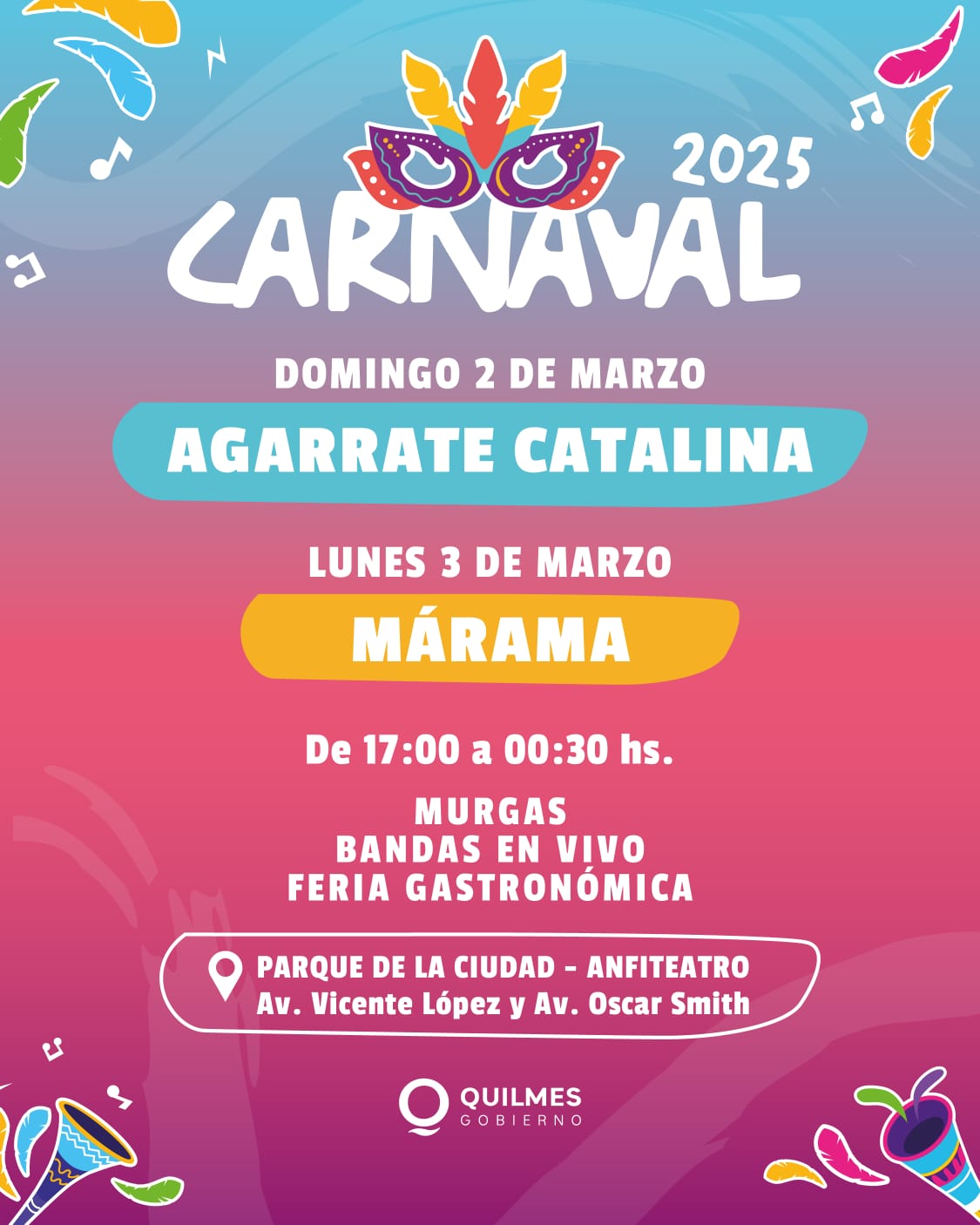 Tendría entrada libre y gratuita, en el anfiteatro del Parque de la Ciudad en Vicente López y Smith (Quilmes Oeste), las presentaciones estelares de la murga Agarrate Catalina y de la banda Márama, además de representantes locales, bandas en vivo y una feria gastronómica con foodtrucks.