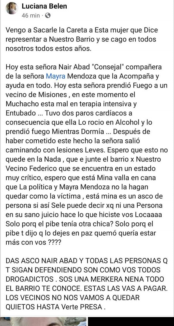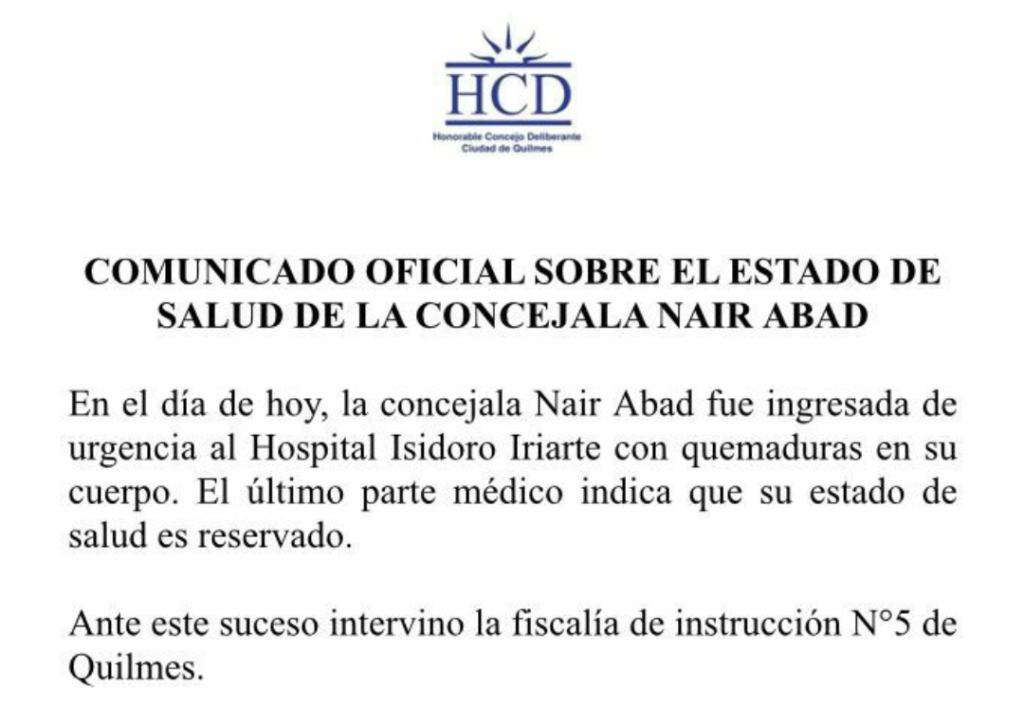 La concejal Nair Abad ingresó esta tarde al Hospital Iriarte con más del treinta por ciento del cuerpo quemado.