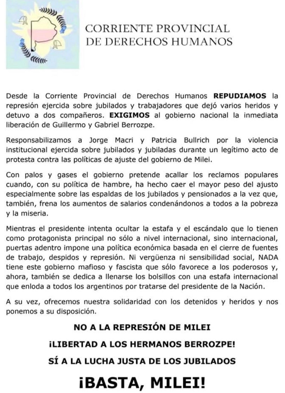 (Comunicado, 26) Repudiamos el accionar represivo del Gobierno Nacional que utilizando a la Policía Federal Argentina el 26 de febrero de 2025 detuvo injustamente a los hermanos Gabriel y Guillermo Berrozpe cuando participaban en la Marcha de Protesta de los jubilados/as y en defensa de los despedidos producto del ajuste de Milei.