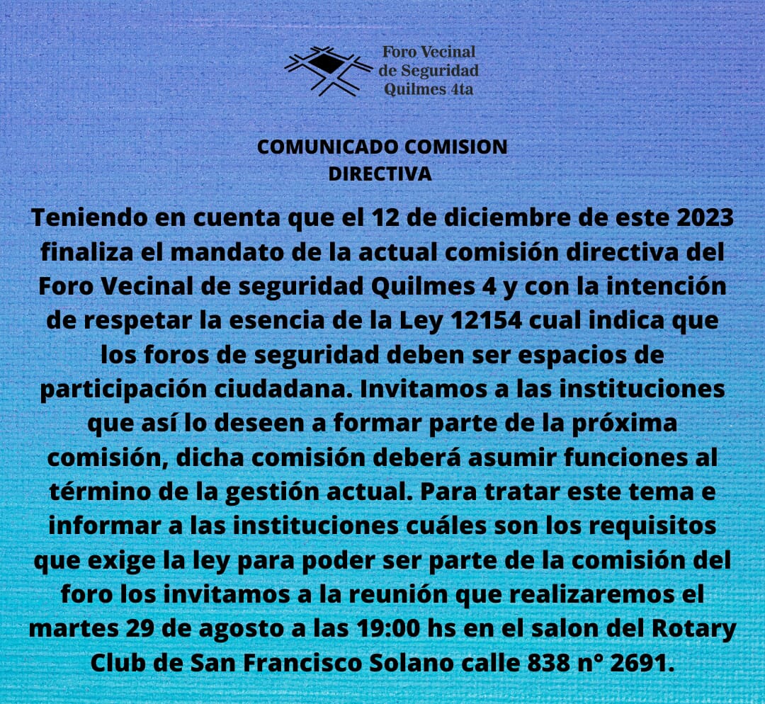 Invitamos a las instituciones que quieran sumarse a la nueva comisión directiva del Foro Vecinal de Seguridad Quilmes 4ta a una reunión el 29 de agosto a las 19 hs en el Rotary Club de Solano calle 838 nro 2691.