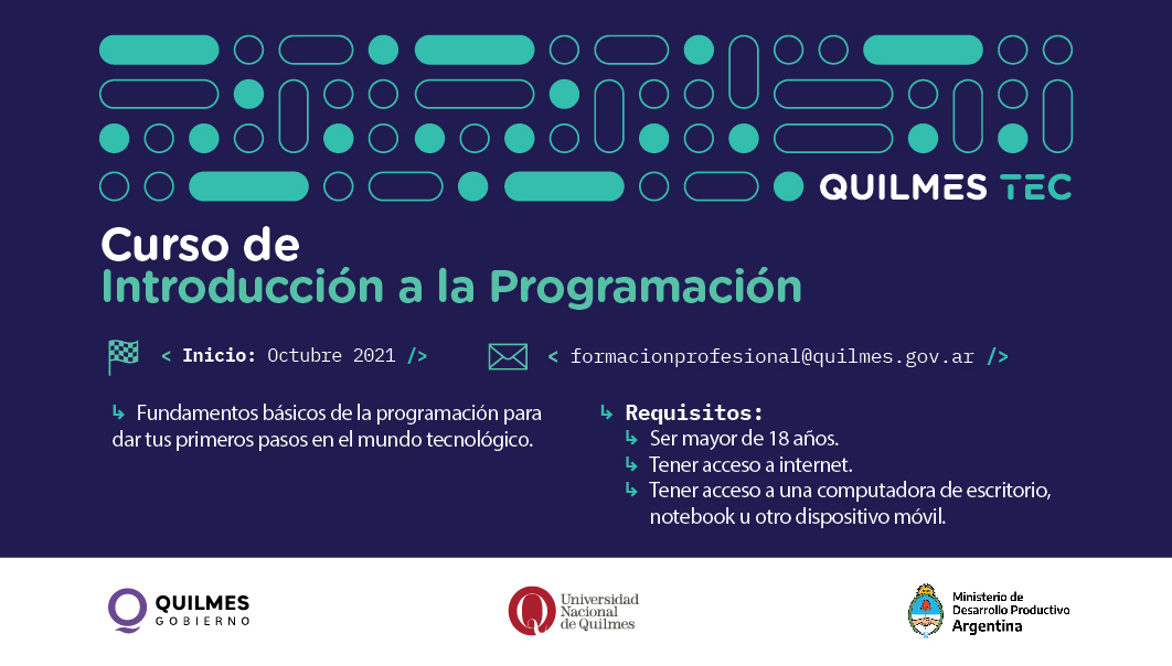 El Municipio informa que sigue abierta la inscripción para el Curso de Introducción a la Programación, una iniciativa de la intendenta Mayra Mendoza con el objetivo de generar empleo en la población de jóvenes quilmeños y quilmeñas. Se iniciará en octubre, y es una actividad articulada con la Universidad Nacional de Quilmes y el Ministerio de Desarrollo Productivo de la Nación.