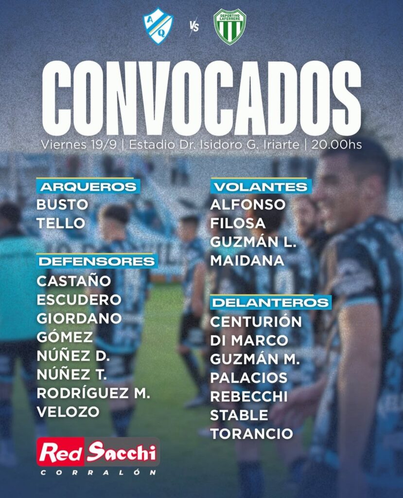 Los convocados para enfrentar al Villero de La Matanza por el técnico criollo Fabián Cecconato son Alejo Tello, Facundo Busto, Santiago Castaño, Agustín Escudero, Arian Giordano, Mauro Gómez, Demian Núñez, Tomás Núñez, Geronimo Velozo, Matías Rodríguez, Sebastián Alfonso, Lautaro Filosa, Leandro Guzmán, Cristian Maidana, Franco Centurión, Valentino Di Marco, Maximo Guzmán, Lucas Rebecchi, Facundo Stable, Elías Torancio y Diego Palacios. De todos esto uno no estará ni en el banco, claro está que no serán los arqueros.