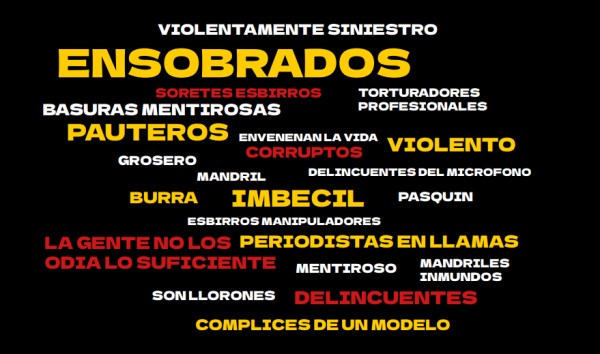 El estudio de la consultora generó una nube de palabras a partir de los términos y adjetivos usados por Milei y otros usuarios contra la prensa. Esta nube (visible en el gráfico adjunto) representa visualmente la frecuencia de uso: las palabras más repetidas aparecen en mayor tamaño. Entre los términos más destacados figuran “ensobrados”, “pauteros”, “imbéciles”, “violento”, “burra” y la frase “periodismo en llamas”. Con menor frecuencia, se observan otros como “esbirros”, “corruptos” y “soretes”.