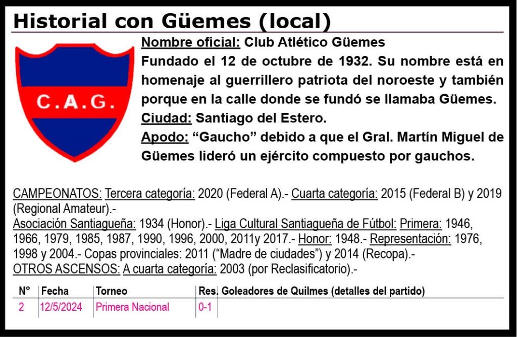 Recién en 2023 Quilmes jugó con Güemes. Desde allí se jugaron tres cotejos. El Cervecero ganó uno (marcó un gol) y perdió dos (tres goles hicieron los santiagueños). Nunca empataron.