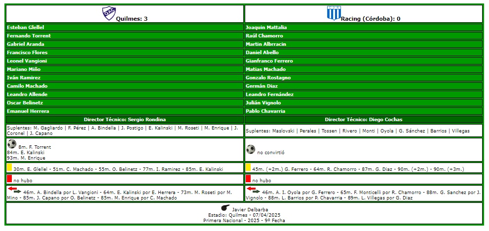 Quilmes ganó 3 a 0 a Racing y quedó cuarto. Dejó atrás el traspié de la fecha anterior con un partido bien jugado a pesar de las vicisitudes climáticas. La lluvia que azotó la ciudad anoche fue el corolario para darle un marco épico al triunfo del equipo de Sergio Rondina. Fernando Torrent y los ingresados Enzo Kalinski y Marcos Enrique marcaron los goles.