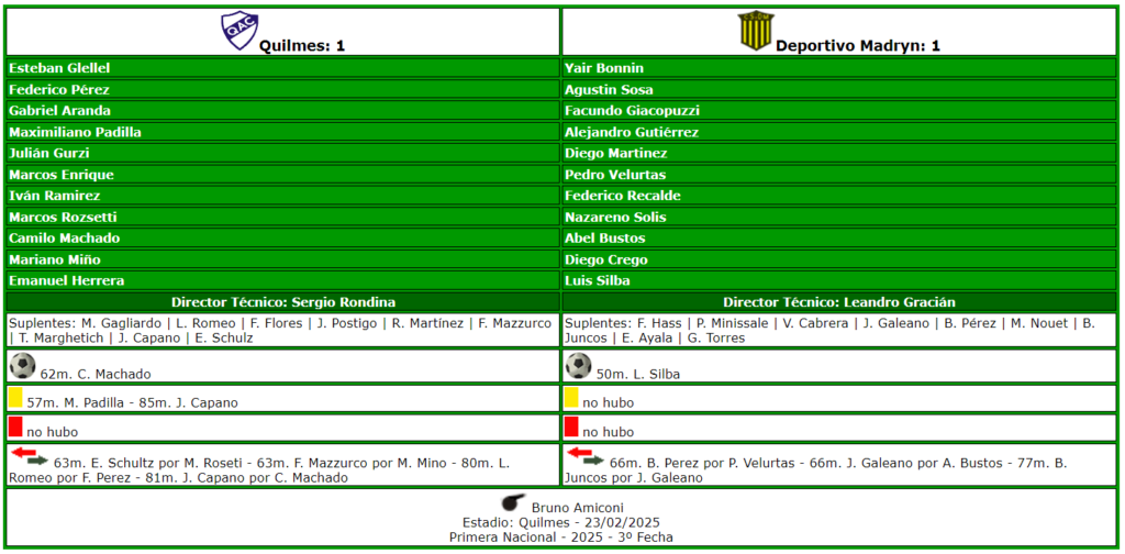 Quilmes empató 1 a 1 en la tercera fecha del campeonato de Primera Nacional. Fue ante Deportivo Madryn en el Centenario. En la primera parte, poco pasó; en el complemento, adelantó Silba a los patagónicos tras un error de Esteban Glellel. El colombiano Camilo Machado igualó para los cerveceros con un golazo de tiro libre. La sensación general fue la de un pobre equipo al que le falta rodaje.