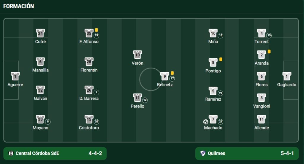 En la segunda parte, sin cambios para el Cervecero ni para Central, las cosas siguieron de la misma manera: sin peligro a los arcos. Pero Omar De Felippe mandó a la cancha a Luis Miguel Angulo que, casi en soledad, fue motivo de preocupación en cada avance santiagueño. En este contexto, Quilmes tuvo una no situación de gol muy clara. Mariano Miño habilitó a Óscar Belinetz y este, en la carrera, adelantó demasiado la pelota al ingresar al área: Alan Aguerre despejó con sus pies y el 9 cervecero vio la amarilla por chocar al golero.