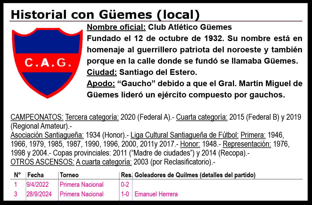 Jugaron, en total, cuatro partidos. Quilmes ganó en una ocasión, empataron una y Güemes venció en dos ocasiones. En goles, los cerveceros señalaron solo un tanto y los gauchos, tres. El elenco blanco lleva dos partidos sin perder ante los santiagueños (victoria y empate).