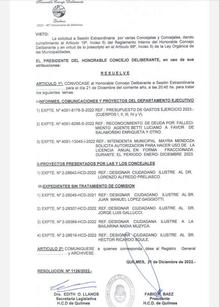 Este miércoles 21 a las 20.45, habrá Sesión Extraordinaria del Honorable Concejo Deliberante, según convocatoria de su presidente, Fabio Báez.