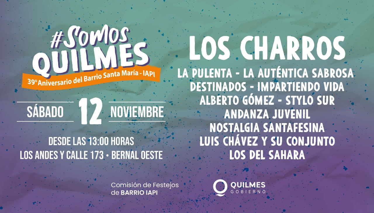 El Municipio invita a celebrar el 39º aniversario del barrio Santa María – IAPI, este sábado 12, desde las 13, en Los Andes y 173, en Bernal Oeste, con una feria gastronómica y shows en vivo en el marco de un nuevo festival Somos Quilmes, que tendrán como cierre de jornada la presentación del reconocido grupo de cumbia Los Charros.