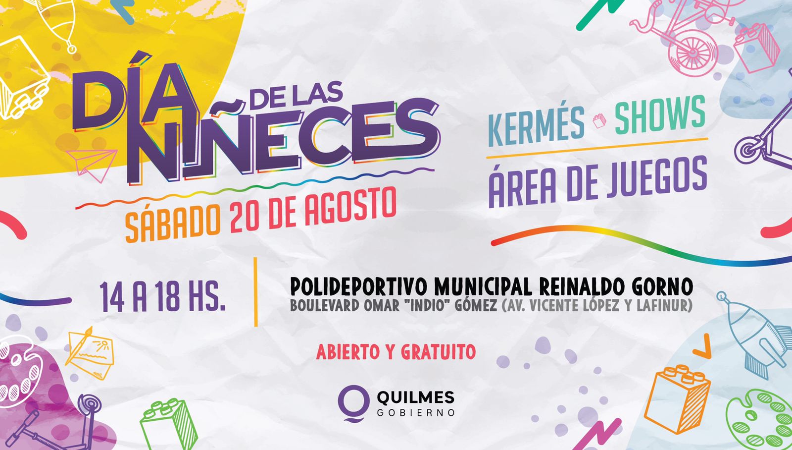 El Municipio invita a todos los vecinos y vecinas del distrito al festival por el «Día de las Niñeces», este sábado 20 de agosto, de 14 a 18, en el Polideportivo Municipal Reinaldo Gorno, en el bulevar Indio Gómez (avenida Vicente López) y Lafinur, en Quilmes Oeste, con entrada libre y gratuita.