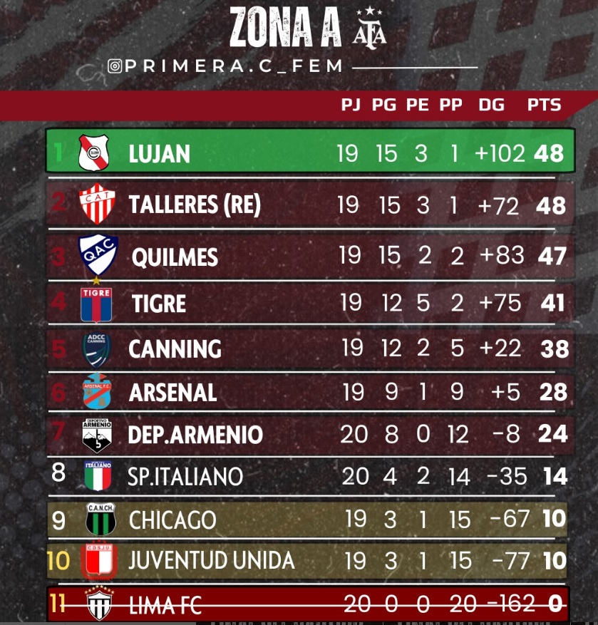 A la última jornada, el equipo de Federico Quiroga llega con 47 puntos y una diferencia de gol de +83. En tanto que Luján (+102 de diferencia) y Talleres (+72) son líderes con 48 puntos. Entonces, además de ganar, Quilmes debe esperar que las de Remedios de Escalada no venzan a Juventud Unida en el predio Javier Pupi Zanetti y que, además, las lujaneras pierdan ante Tigre en el norte del conurbano.