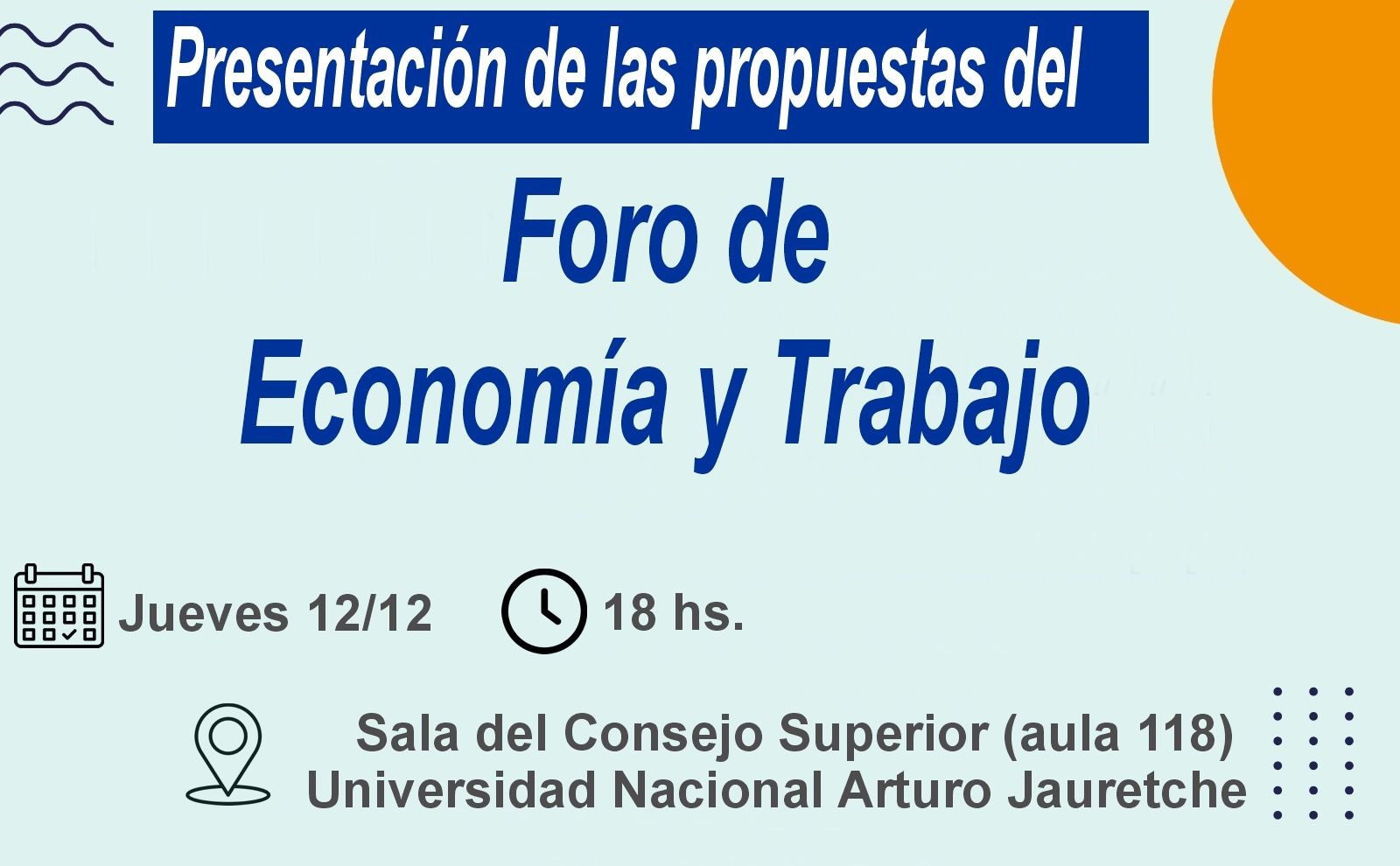 Este jueves 12, a las 18, se llevará adelante un encuentro abierto para interesados en la Sala del Consejo de la Universidad Nacional Arturo Jauretche (Aula 118, Edificio Mosconi, Calchaquí 6200), para presentar las propuestas centrales del FEyT, con anuencia del Foro Regional Berazategui, Quilmes y Varela de Economía Trabajo y Producción.