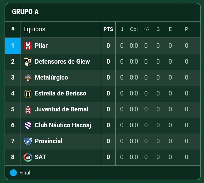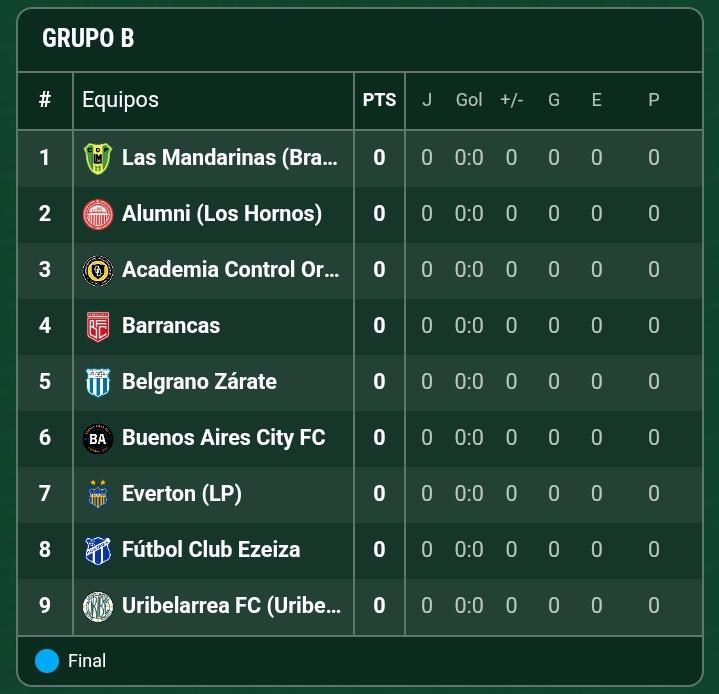 - Zona: Control Orientado, Everton (La Plata), Las Mandarinas, Belgrano (Zárate), Alumni, Barrancas FC, Buenos Aires City, Ezeiza FC y Uribelarrea FC.