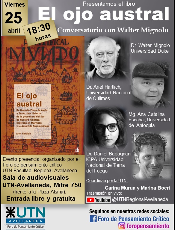 El viernes 25 se hará el conversatorio sobre el libro del investigador Ariel Hartlich El ojo austral, De Guamán Poma de Ayala a Perón. Una historia de la geocultura del Sur de Nuestra América, centrada en Malvinas y la Antártida Suramericana, con la presencia del doctor Walter Mignolo. La jornada llevará adelante en la sala de audiovisuales de la sede “Graciela Pane” de la Universidad Tecnológica Nacional, Avenida Mitre 750, Avellaneda (frente a la Plaza Alsina), con entrada libre y gratuita.